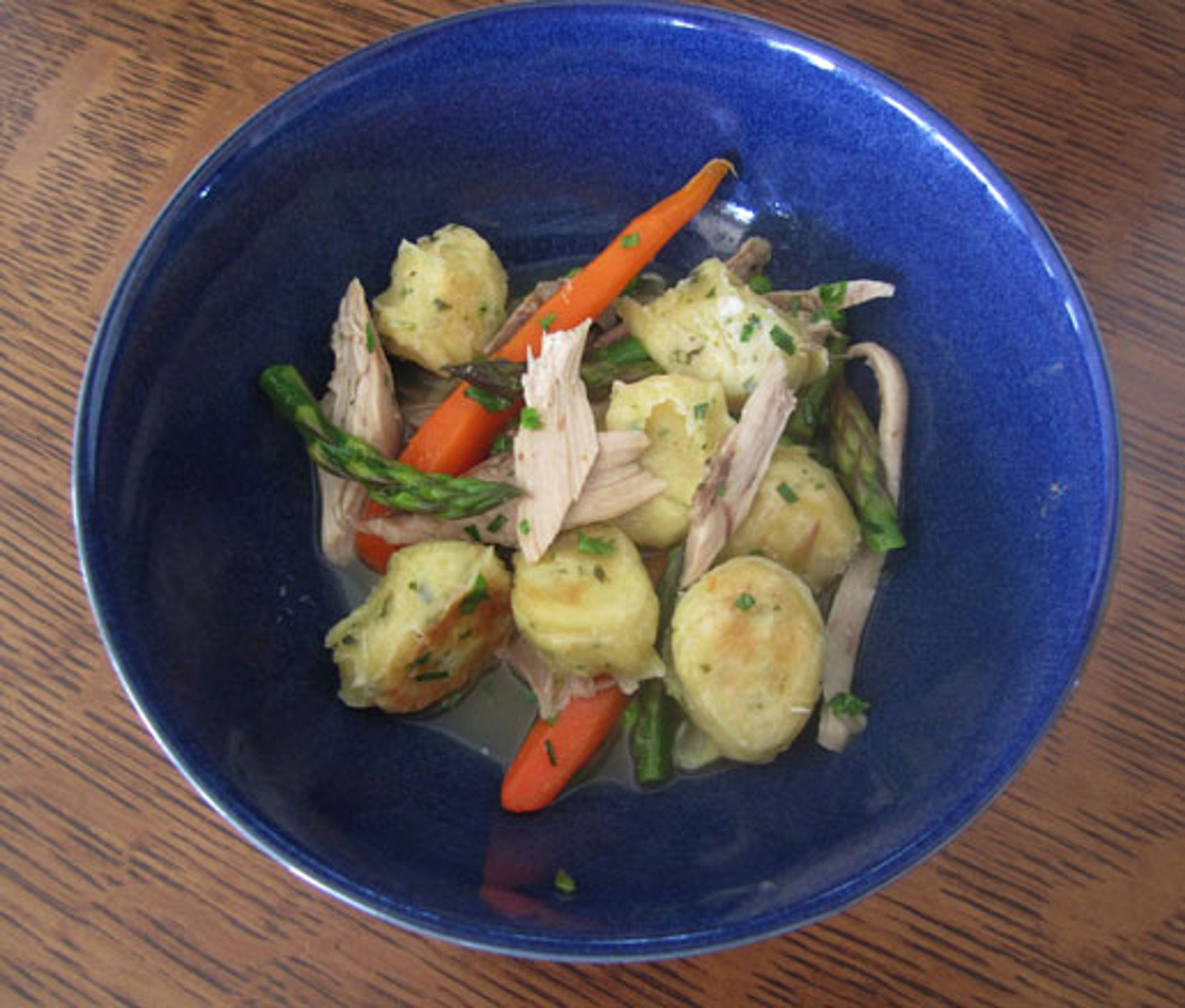 We love this dish of luscious dumplings and succulent rabbit for its flexibile use of spring vegetables. Use whatever looks best at the farmers’ market, or whatever you happen to have on hand.