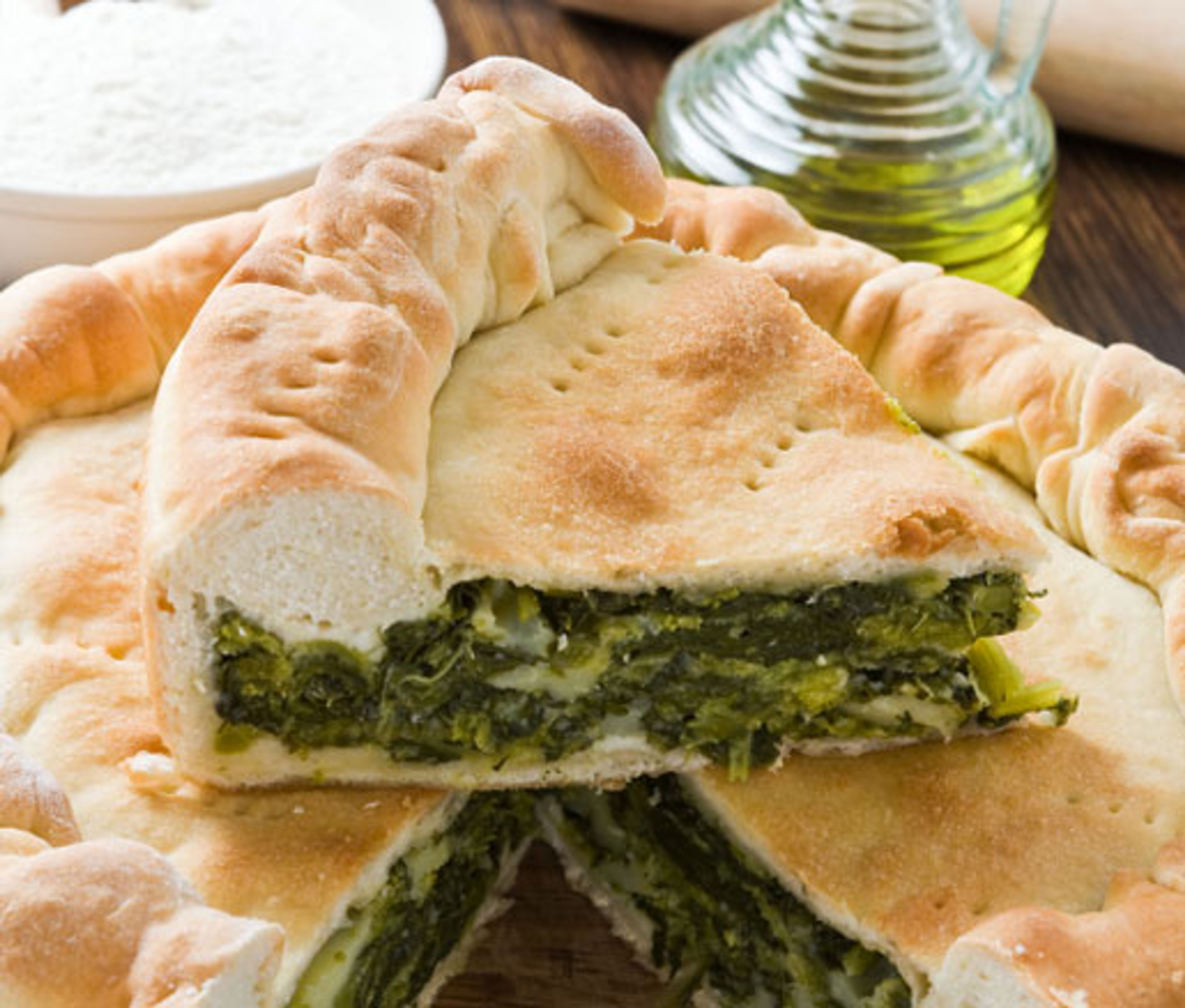 Roll out the remaining piece of the dough to a thickness of about a quarter of an inch. Drape over the filling in the pan. Pinch the top and bottom crusts together and crimp the edges, trimming away any excess dough. Using a paring knife, cut several small slits into the top of the torta. Brush the torta with olive oil and sprinkle lightly with sea salt. Move the dish onto a baking sheet and place in the oven. Bake for 65 to 70 minutes or until golden brown. Remove from the oven and let cool for at least 15 minutes before serving.
