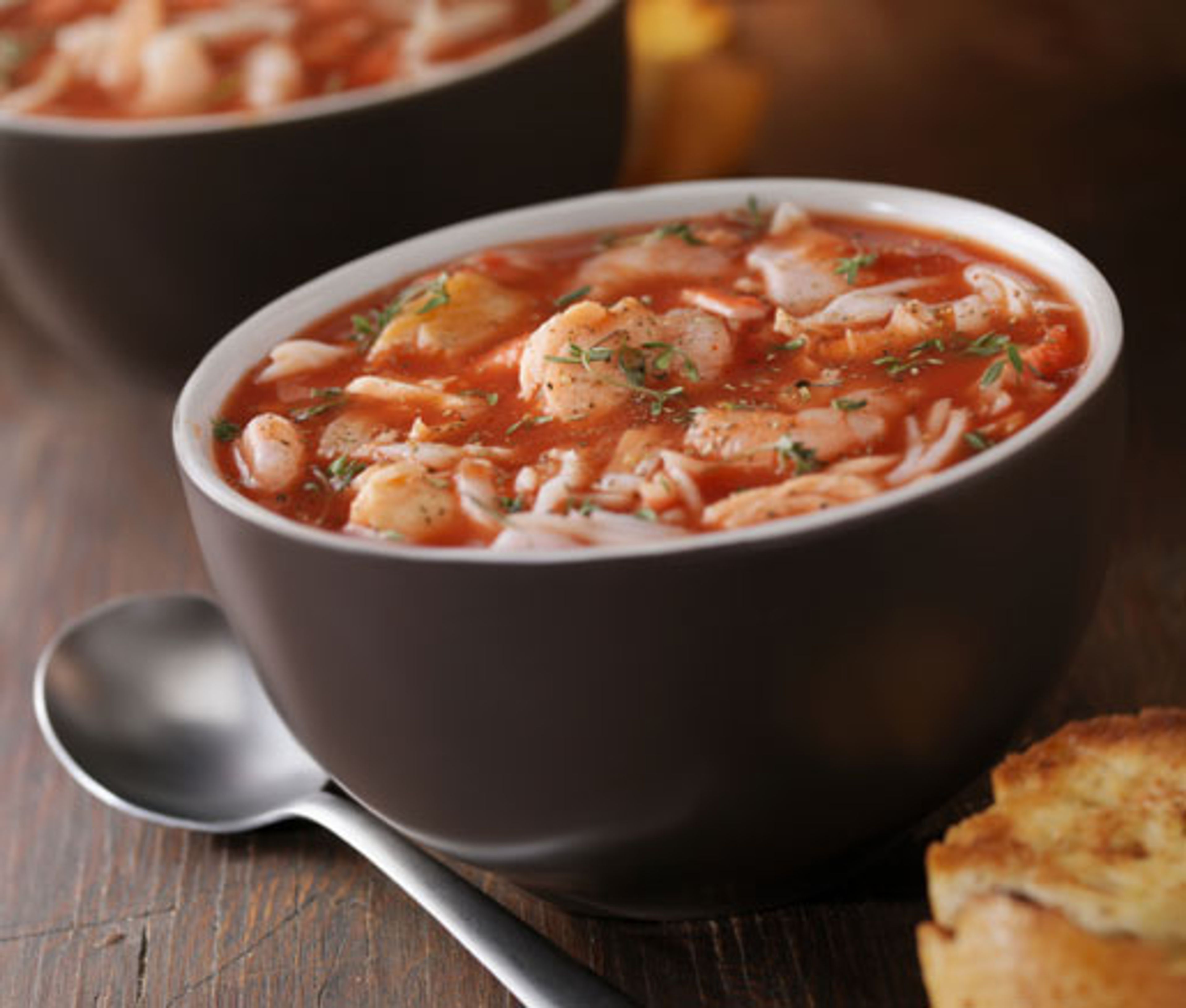 To finish the soup, add the chunks of monkfish to the simmering broth, cover, and cook for 5 minutes. Drop in scallops, stir, and simmer for 7 minutes more. Add the shrimp, return the broth to a bubbling simmer, and cook for a minute or two, just until the shrimp are cooked through. Serve immediately in warm shallow soup bowls.