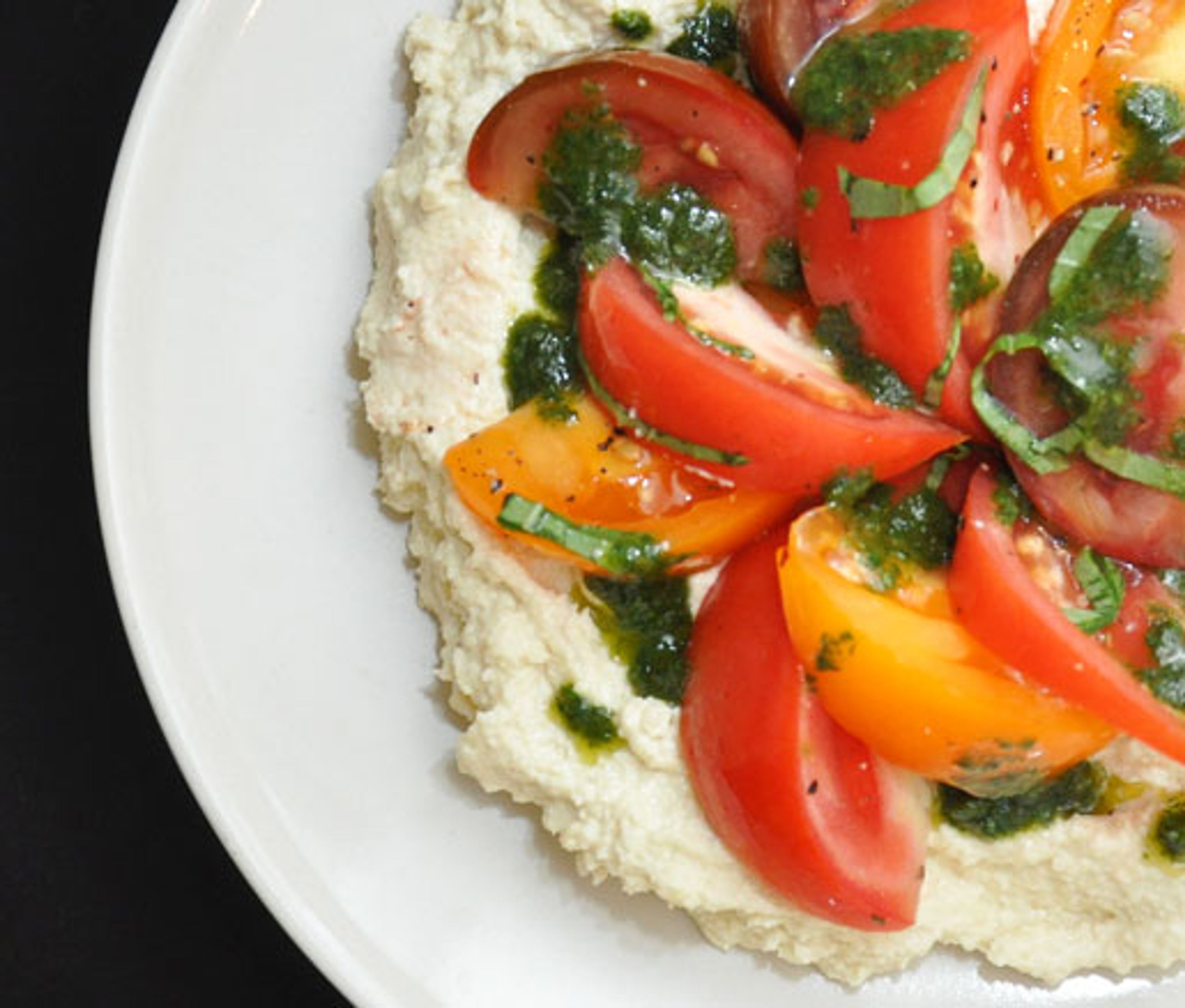A unique hummus acts as a surprising complement to flavorful heirloom tomatoes.