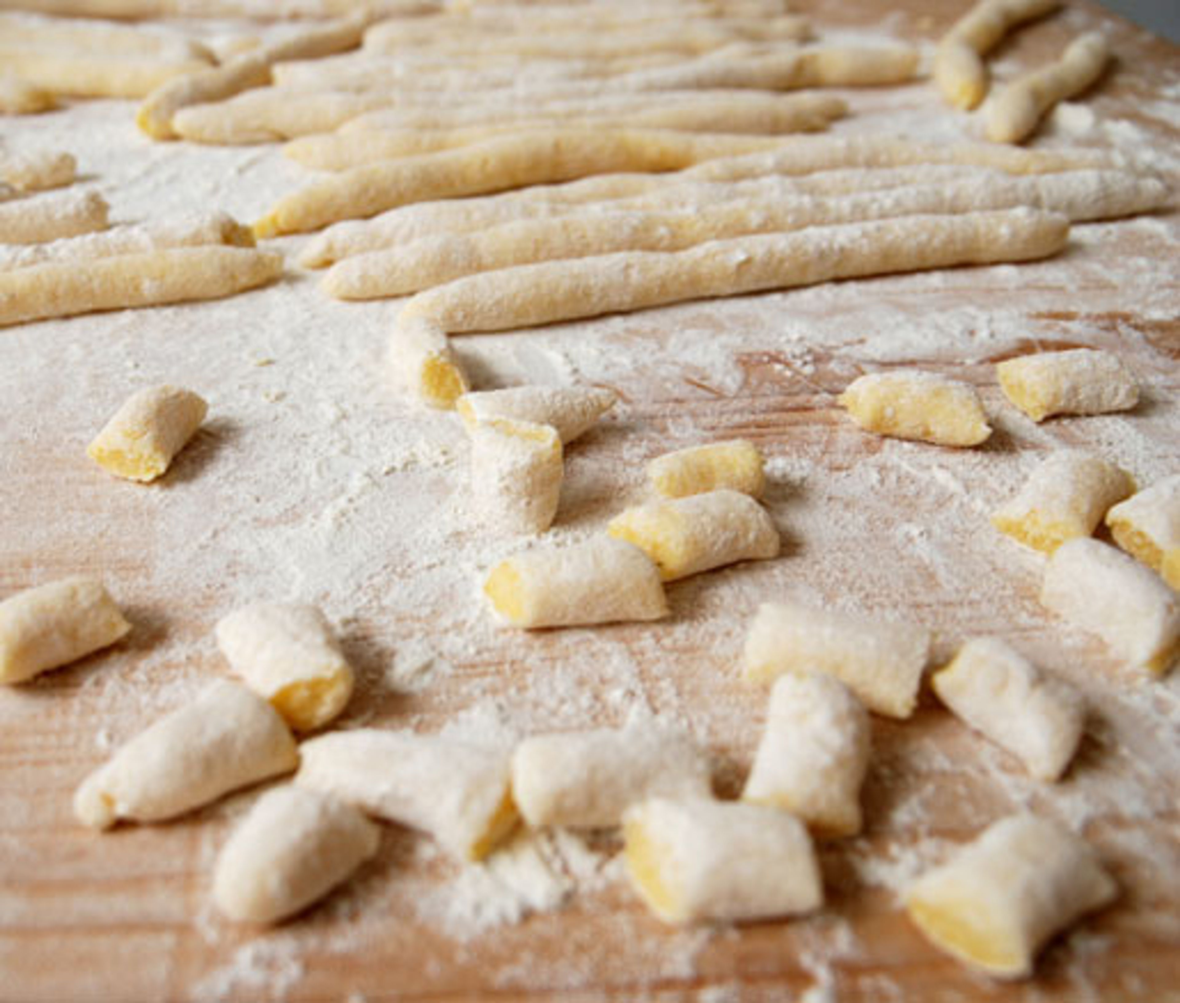 Using the bench scraper dusted with flour, quickly cut the gnocchi into 1/2-inch pieces. Sprinkle each cut piece with flour and move them to a floured baking pan so they do not stick together. Leave the gnocchi at room temperature to rest for 20 minutes before cooking.