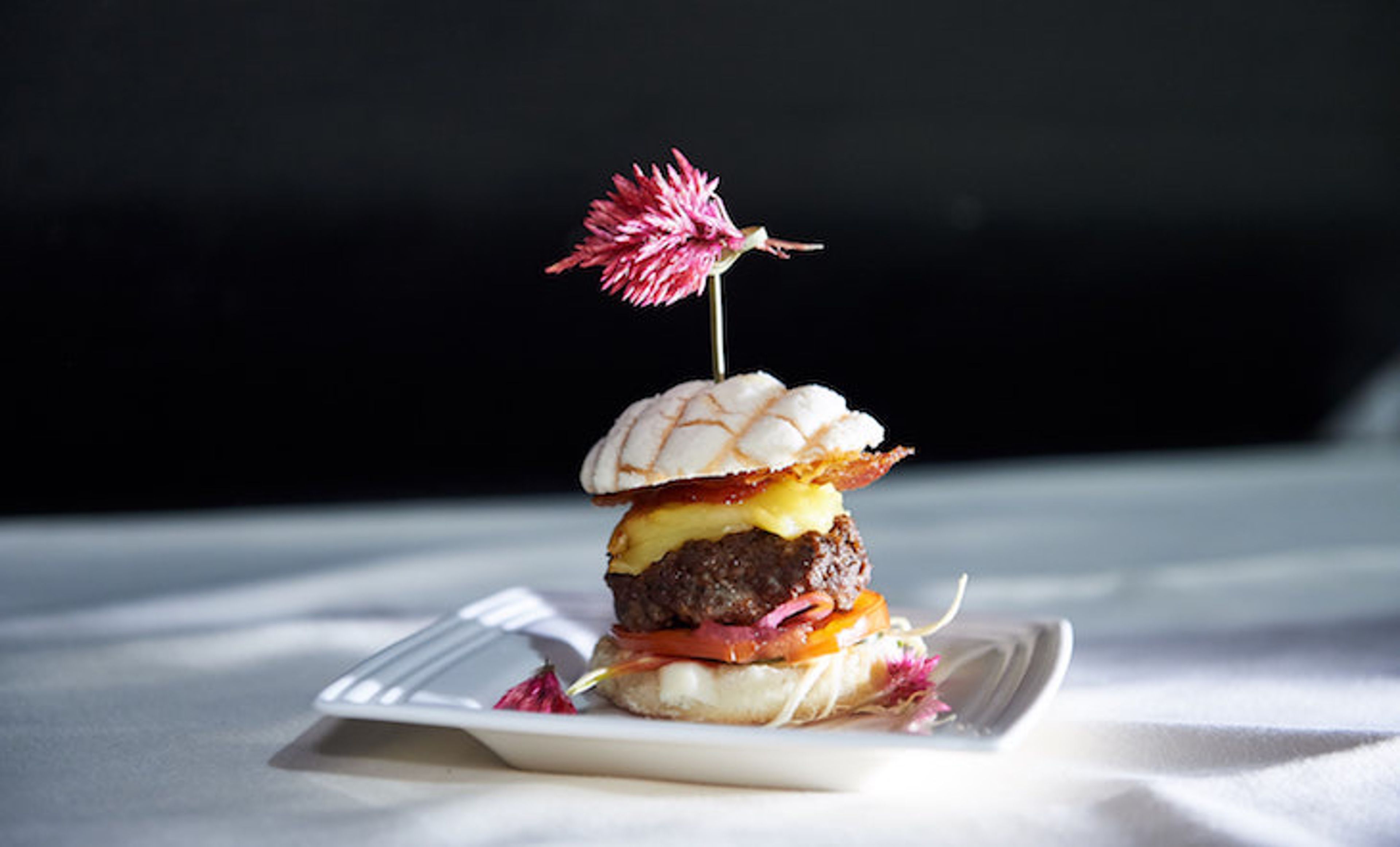 The Concha Burger, a winner of our 2016 Blended Burger Project™, features a shiitake, chorizo, and beef patty topped with homemade strawberry–fig jam, chipotle aïoli, pickled cucumbers, butter lettuce, bacon, tomato, and a fried egg.