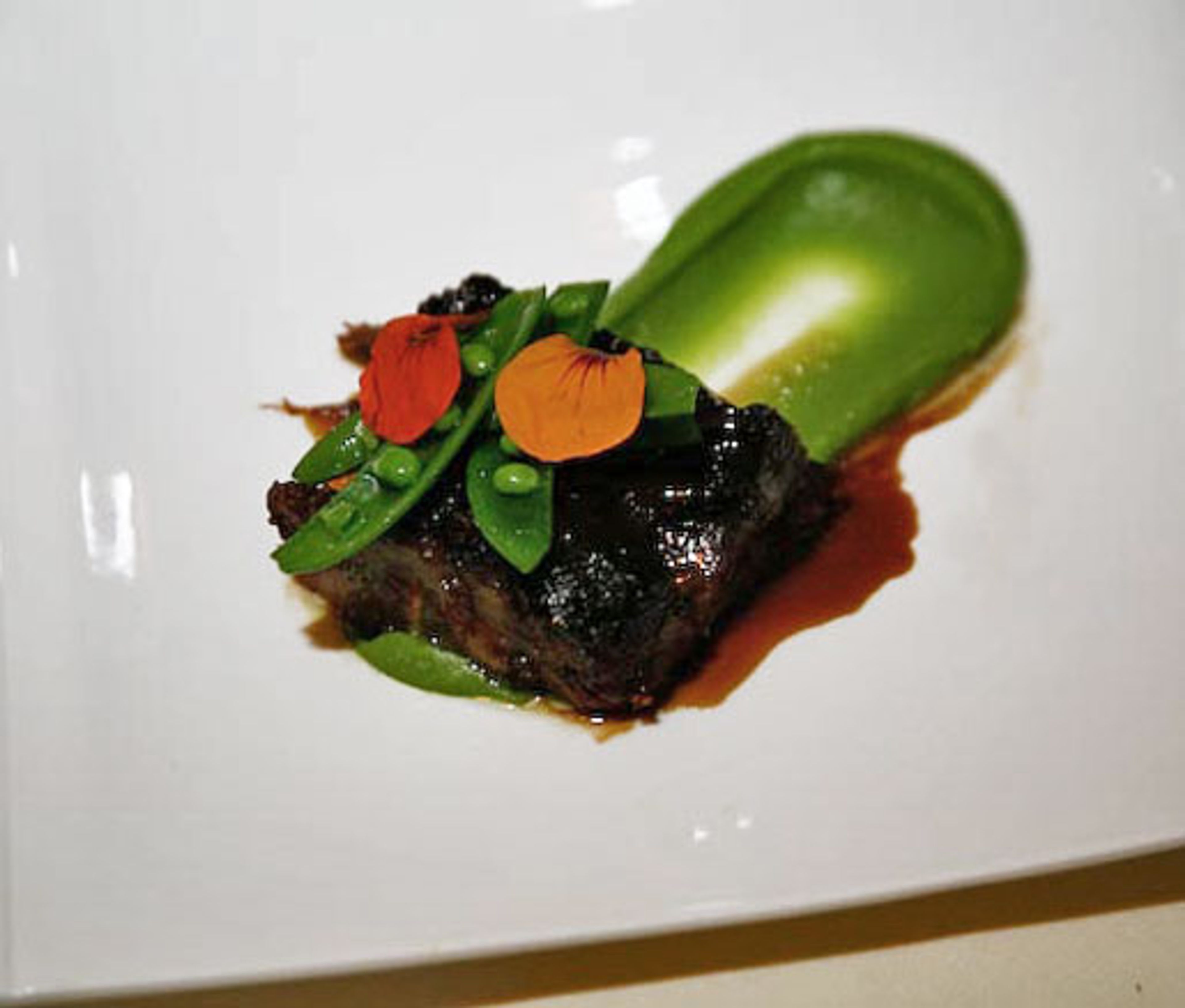 To serve, put a large spoonful of the pea purée in the center of a serving plate, then top with a short rib. Top with the caramelized onions. Plate some sautéed snap peas next to the short rib. Drizzle with the reduced braising liquid.