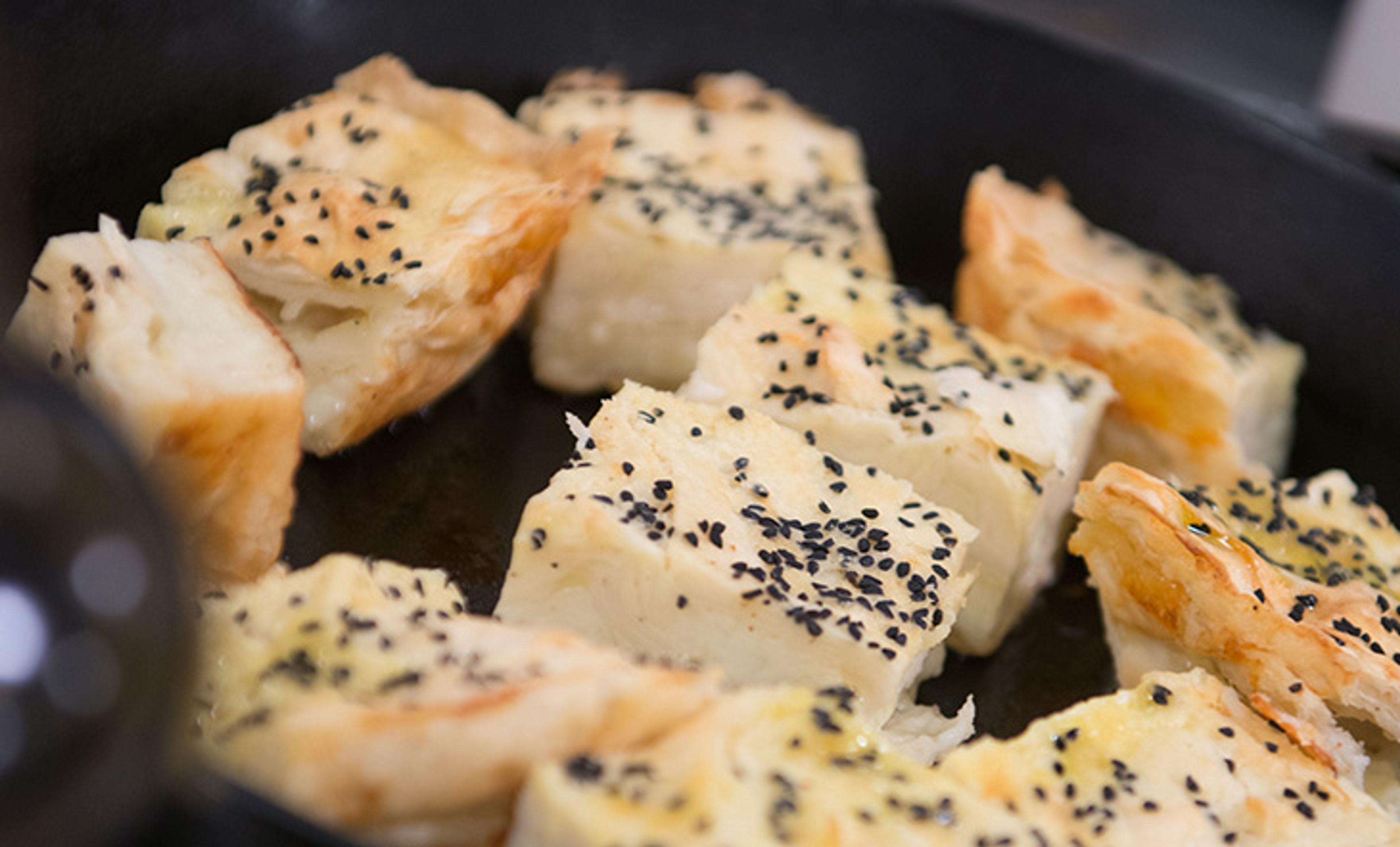 Mix the remaining milk mixture with the egg yolks and flour. Pour over the top and let soak for 20 minutes. Eventually, the liquid soaks into the pie, so don’t worry if it seems like a lot. Sprinkle the top with the nigella and ground pumpkin seeds.