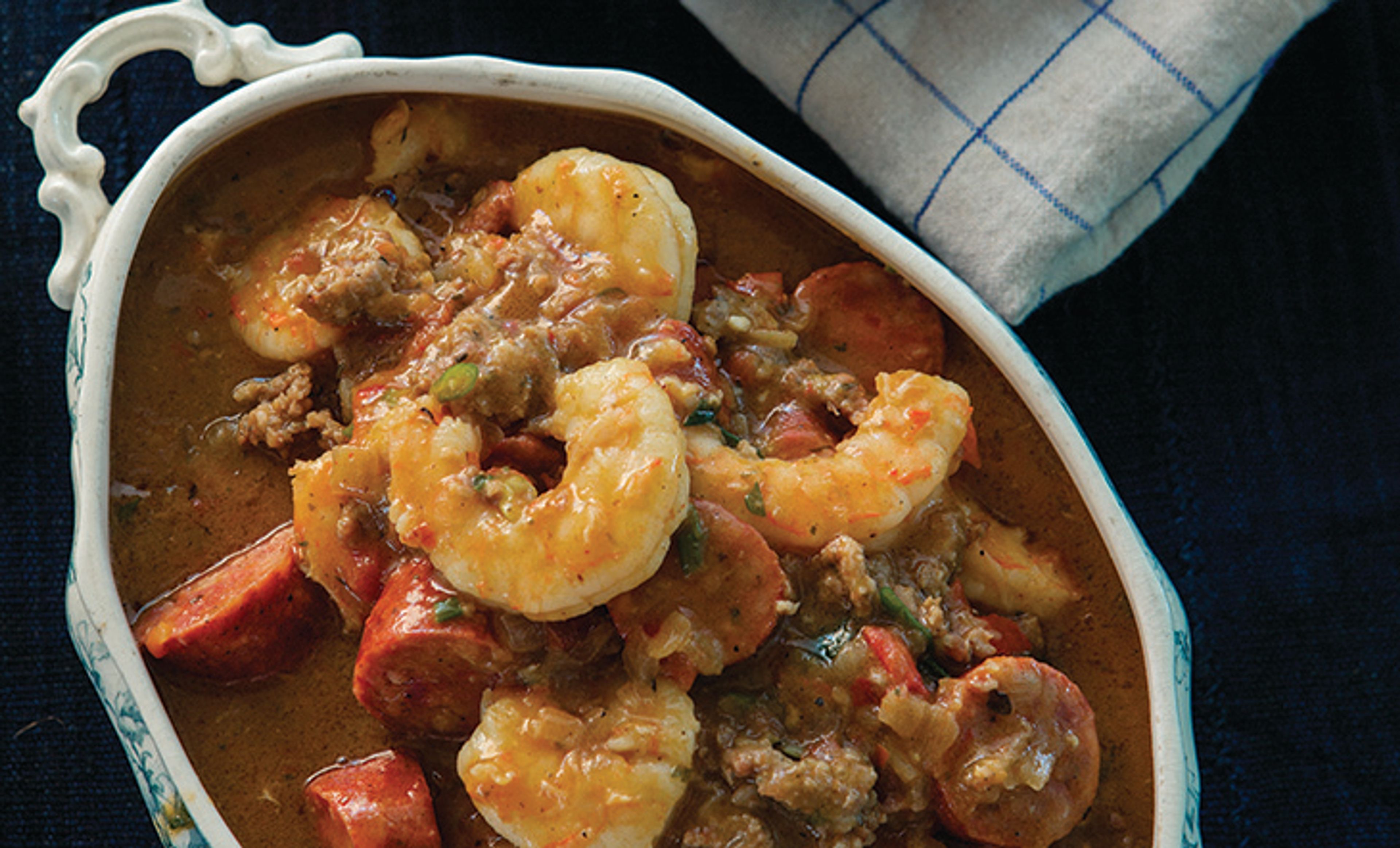 In the same pan, sauté the smoked sausage, crumbled sausage, onions, garlic, and thyme until aromatic, about 5 minutes. Add the stock and bring to a simmer. Reduce the sauce until it’s nice and thick, 3 to 5 minutes. Return the shrimp to the skillet and cook for another 5 minutes. Add the diced tomatoes and lemon juice.