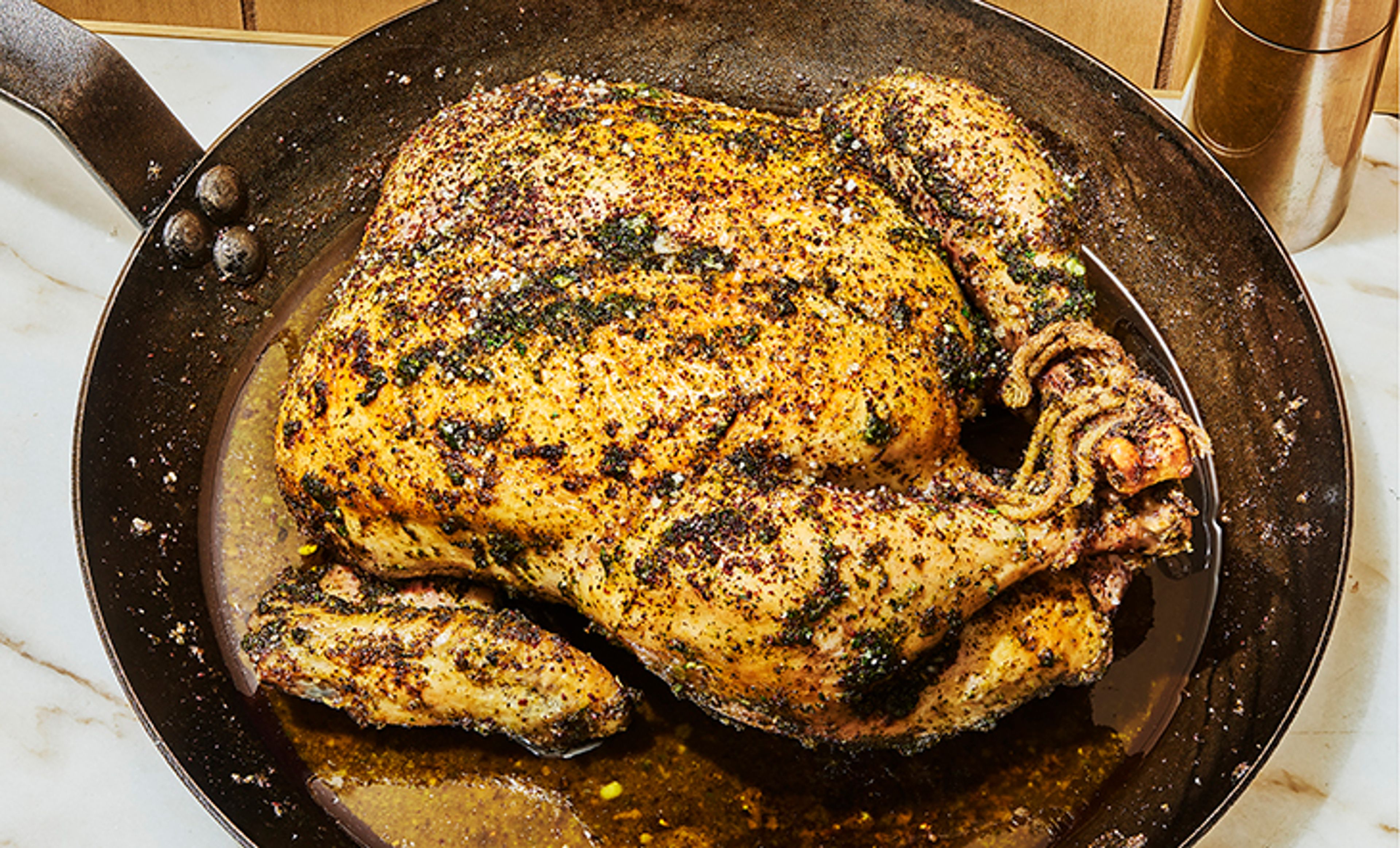 Prepare the chicken: in a glass or enamel roasting pan large enough to fit the entire chicken, smear the chicken with half of the olive oil mixture and season generously with sumac, sea salt, and pepper. Using butcher’s twine, truss the legs together and wings behind the back. Place the bird, breast-side up, and roast in the oven until the meat reads 155°F at the joint with a meat thermometer, about 35 to 45 minutes, depending upon the size of the bird.