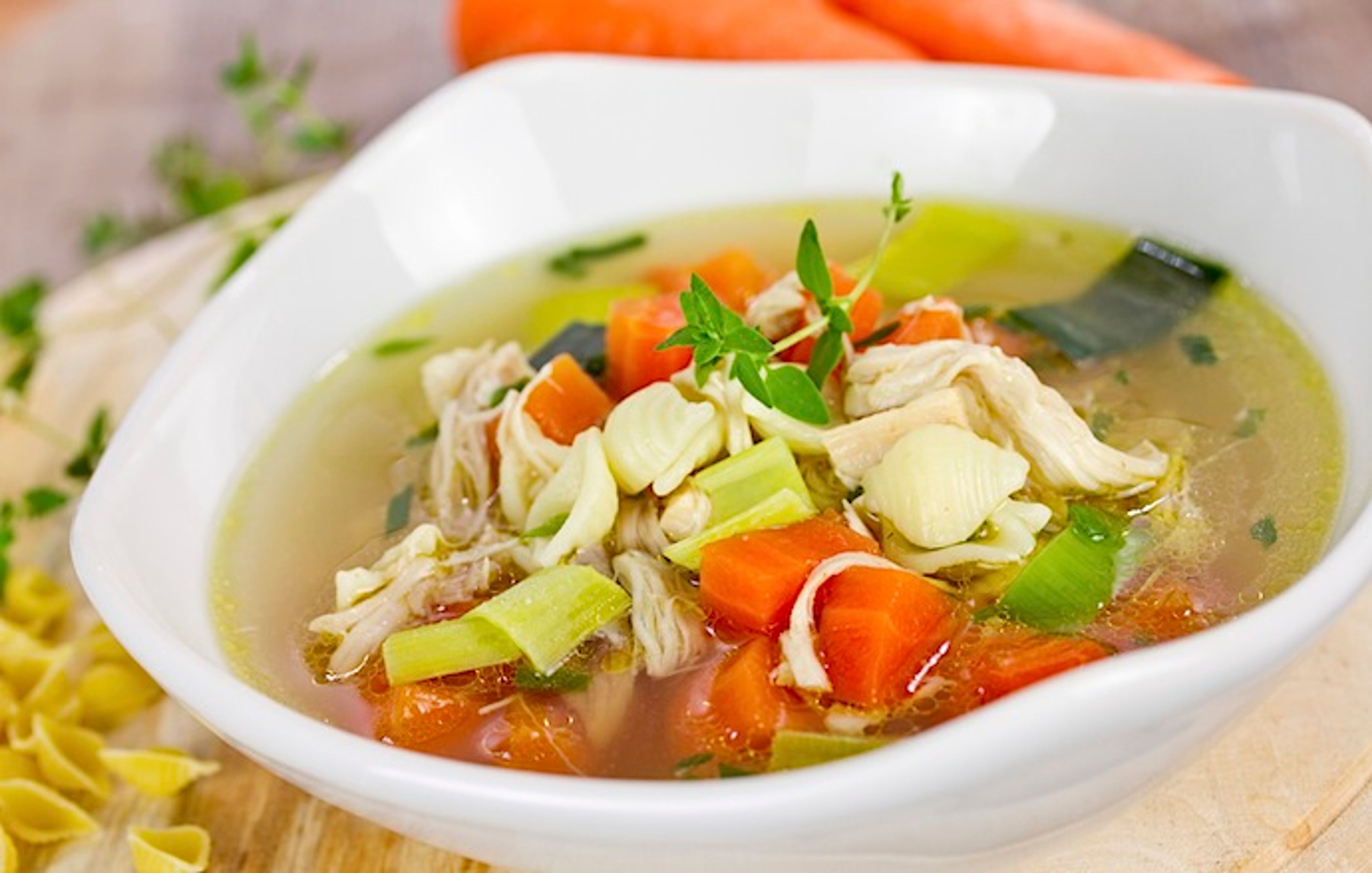 Remove the chicken, skim excess fat from the broth, and remove the vegetables. (If you are not serving the soup until the next day, it will be easier to remove the fat if the broth is cooled and then chilled.) Pour the broth into a container, wash out the kettle, and then return the broth to it.