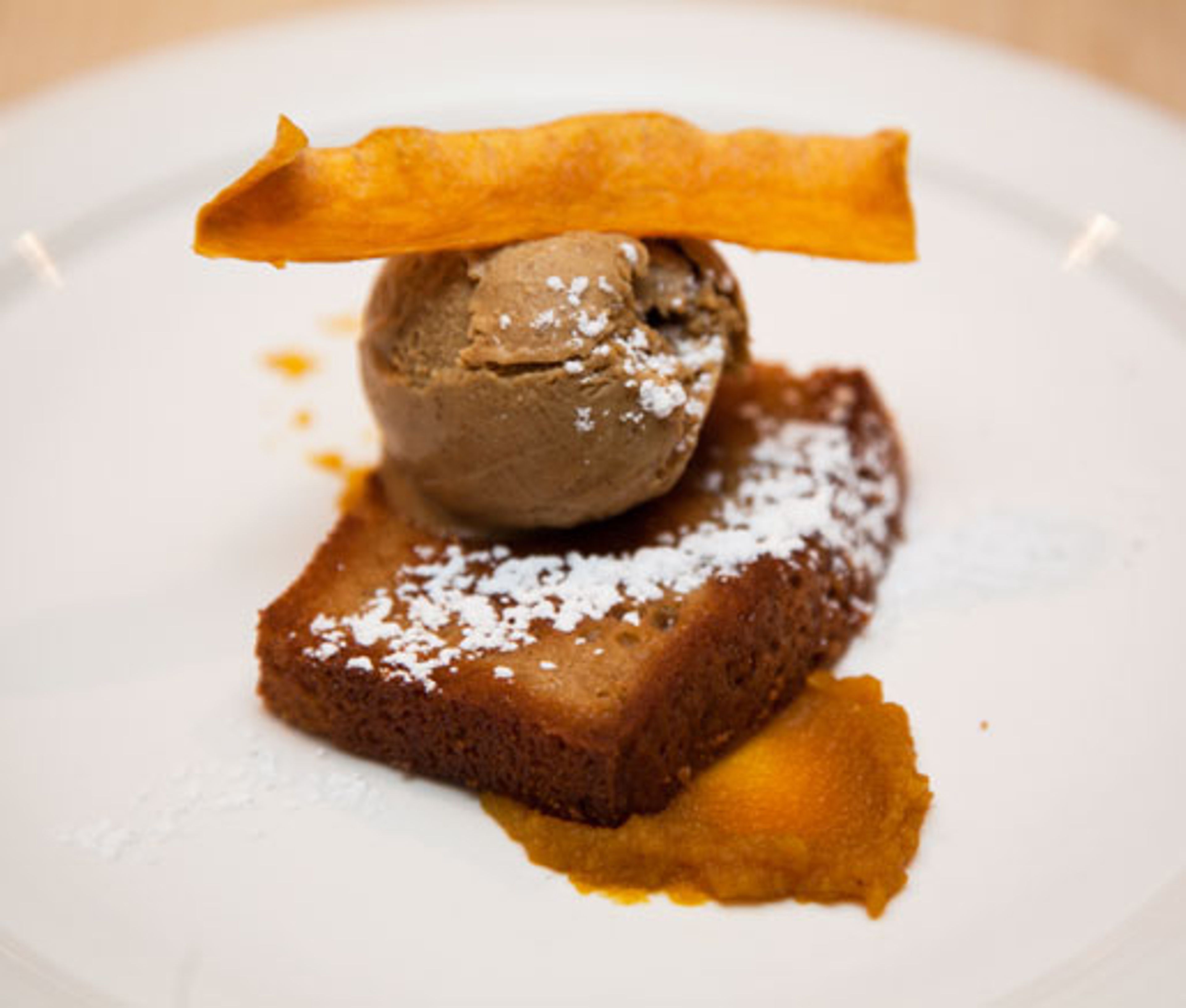 Maple Cake with Indian Pudding Ice Cream and Pumpkin Chips