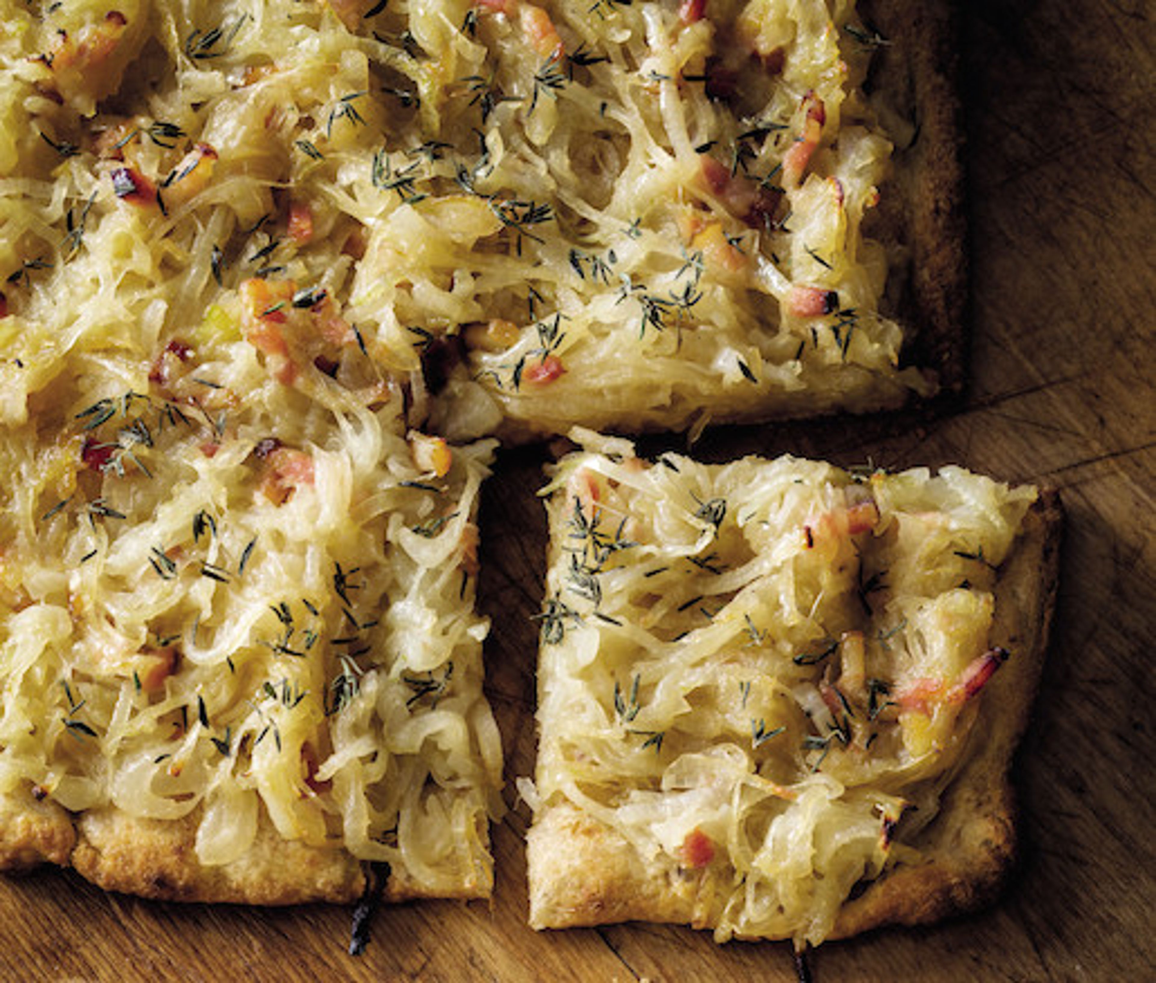 Preheat the oven to 400°F. Heat 1 tablespoon of the oil in a large skillet over medium heat. Add the bacon and cook until it’s lightly brown, about 6 minutes. Add the onions and a large pinch of salt and sweat until completely soft and golden, about 20 minutes.