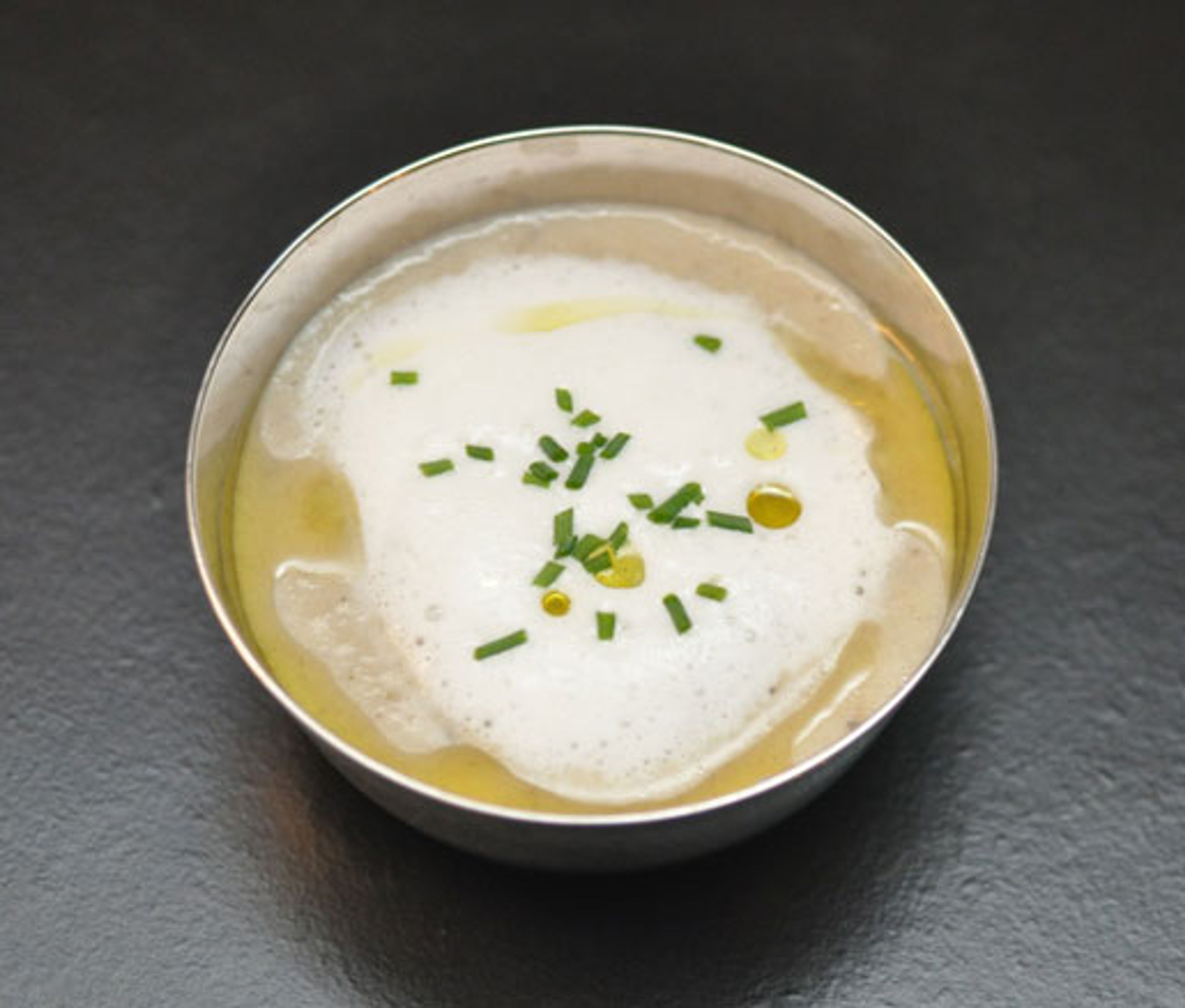 Pour the soup into small bowls or cappuccino cups. Spoon some milk foam on top of each bowl of soup. Garnish each bowl with a few drops of white truffle oil and sprinkle with chives.
