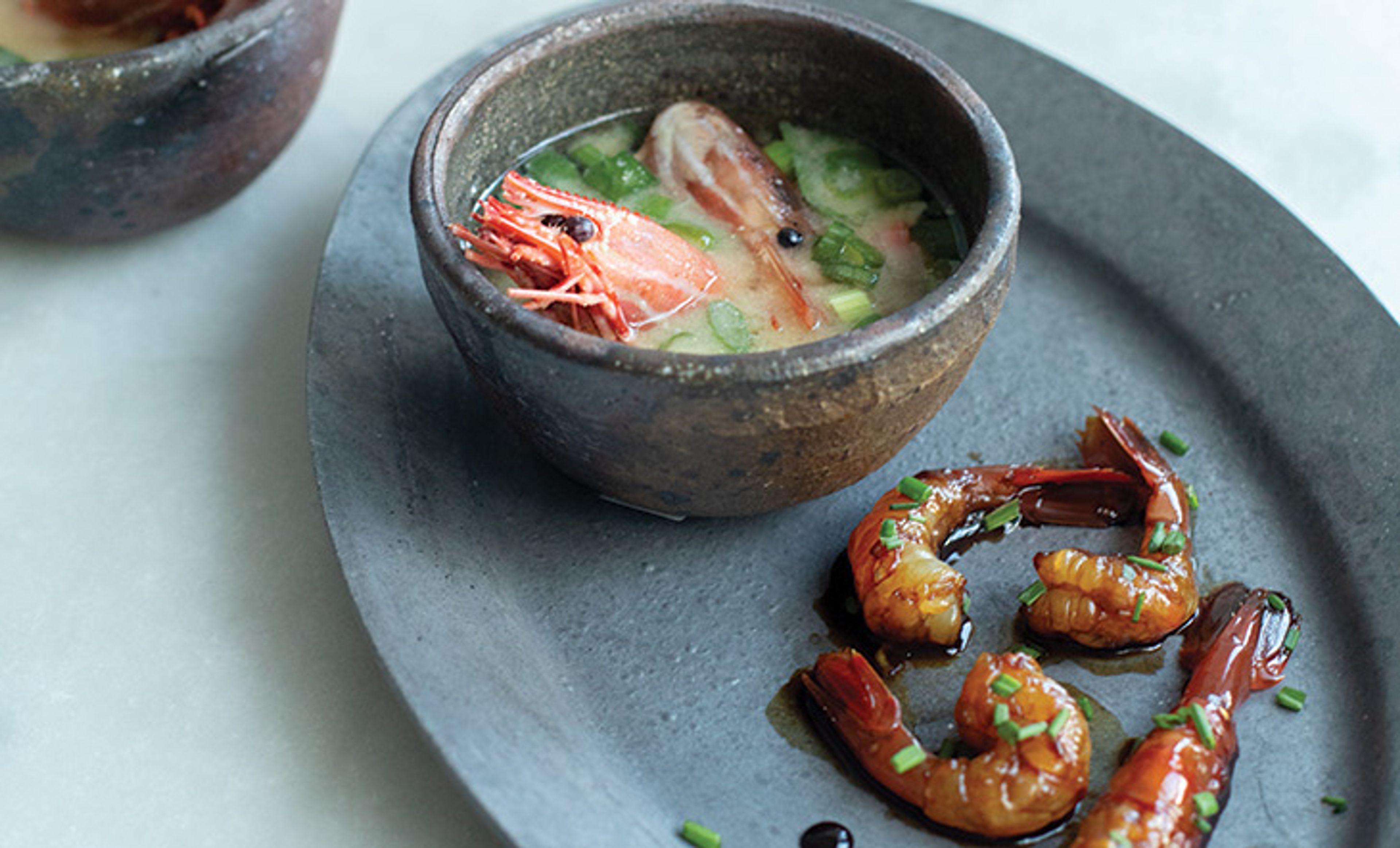 "While Mutsuko Soma’s culinary reputation mostly revolves around the fresh soba noodles she rolls out each day in her restaurant, many of the gems on her menu involve her reverent, delicate treatment of seafood. For this recipe, she uses a technique called kimi zyoyu (or soy sauce and egg), to quick-cure the prawn bodies, then creates a warming miso soup from the heads to wash it down. And once you sip the soup, 'you have to suck the heads,' she says. 'It’s mandatory.'
