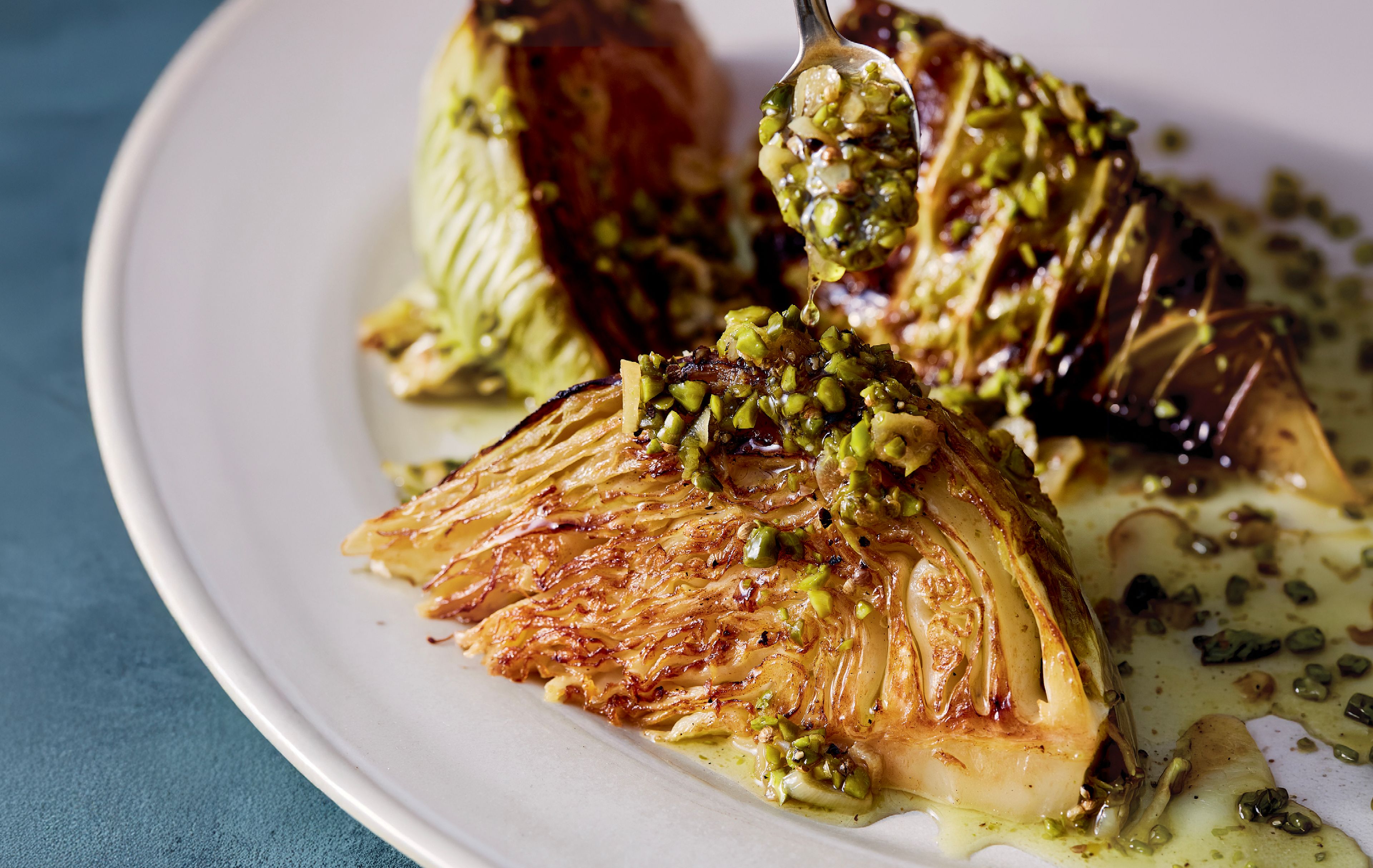 Steamy Roasted Cabbage with Crispy Garlic Pistachio Oil