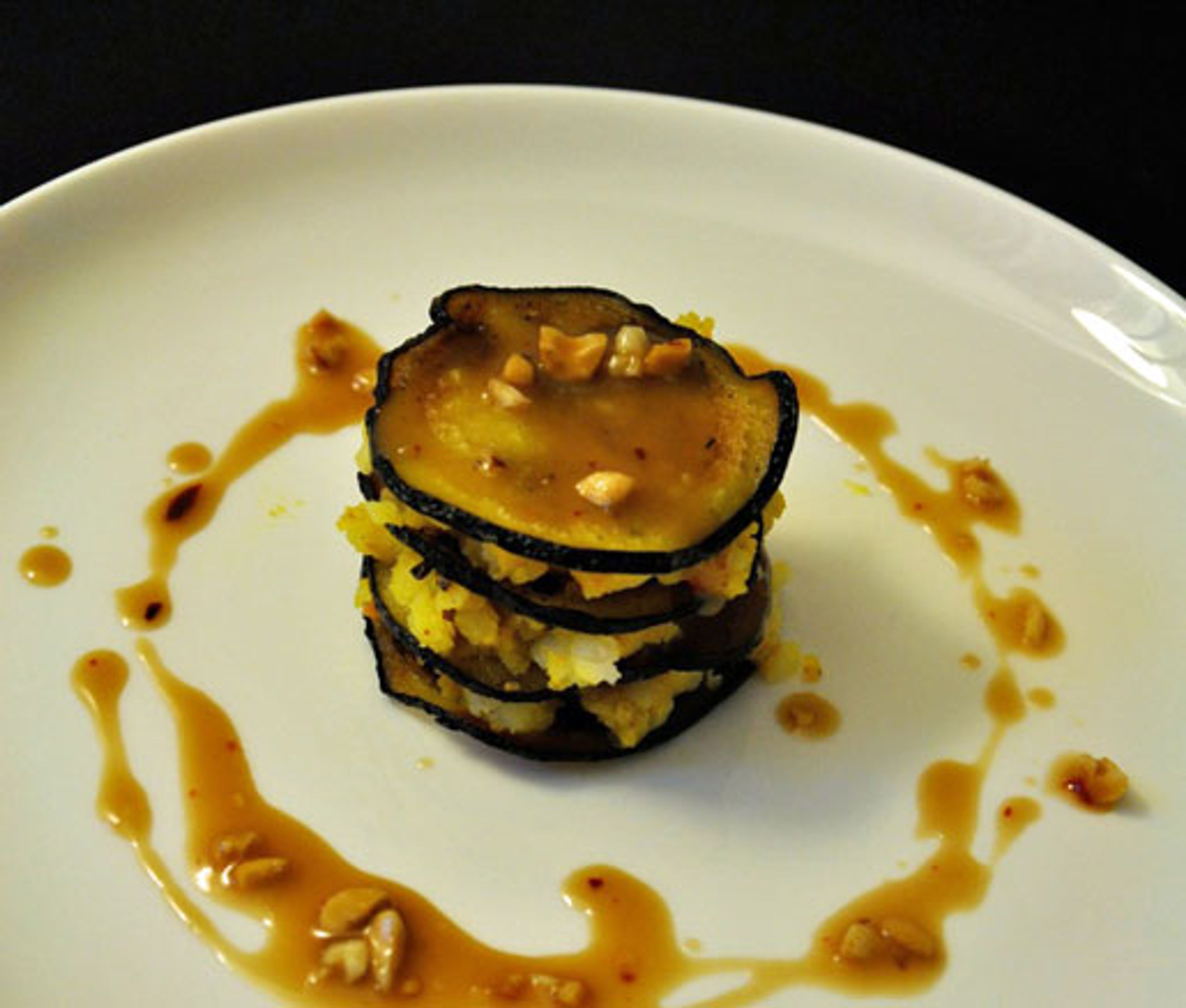 Vikram Sunderam made this stacked eggplant and potato dish at his 2010 Beard House dinner.