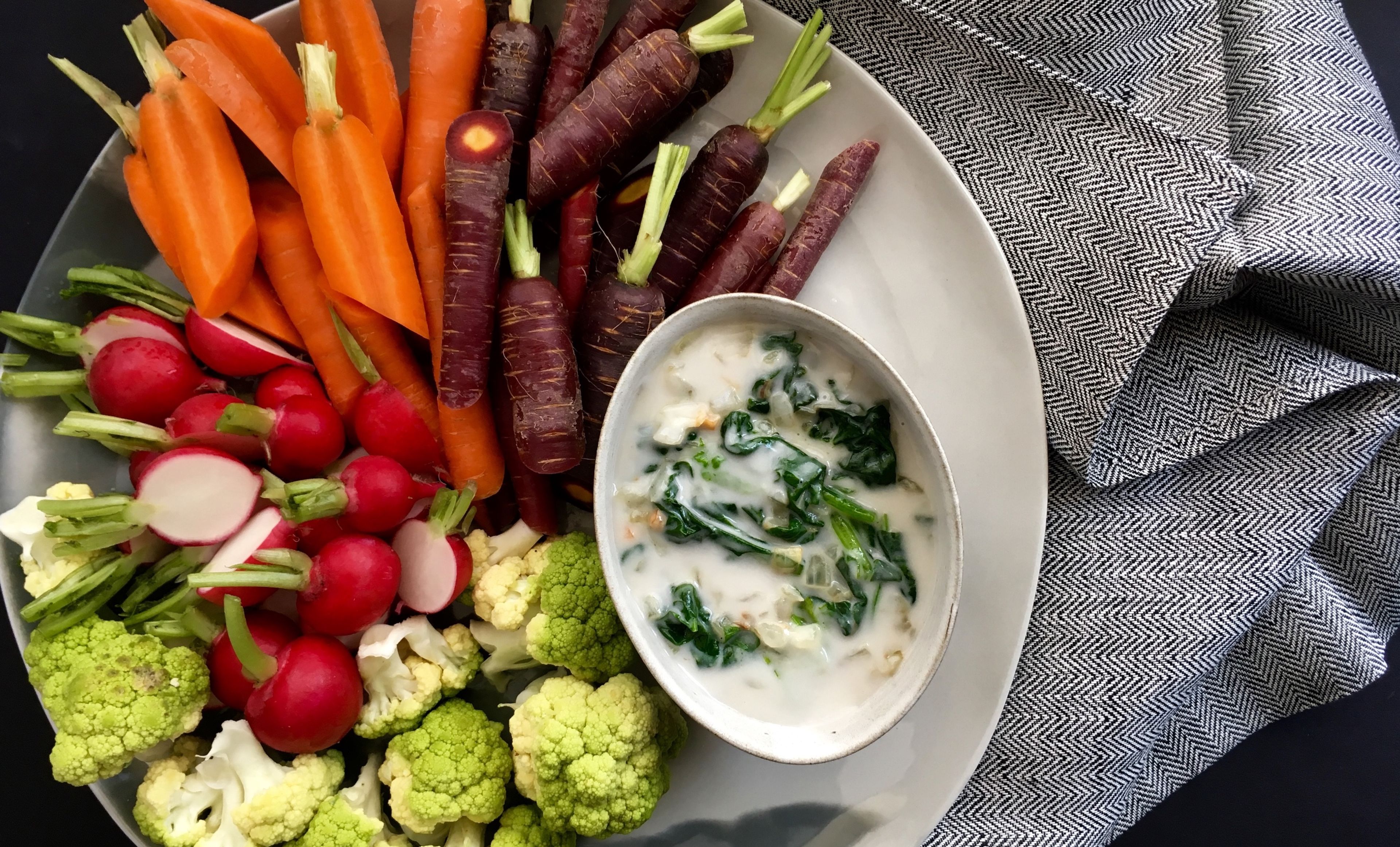 Add the sautéed greens to the béchamel sauce and mix to combine. Transfer the dip to a serving dish and serve either hot or chilled with assorted vegetables and chips.