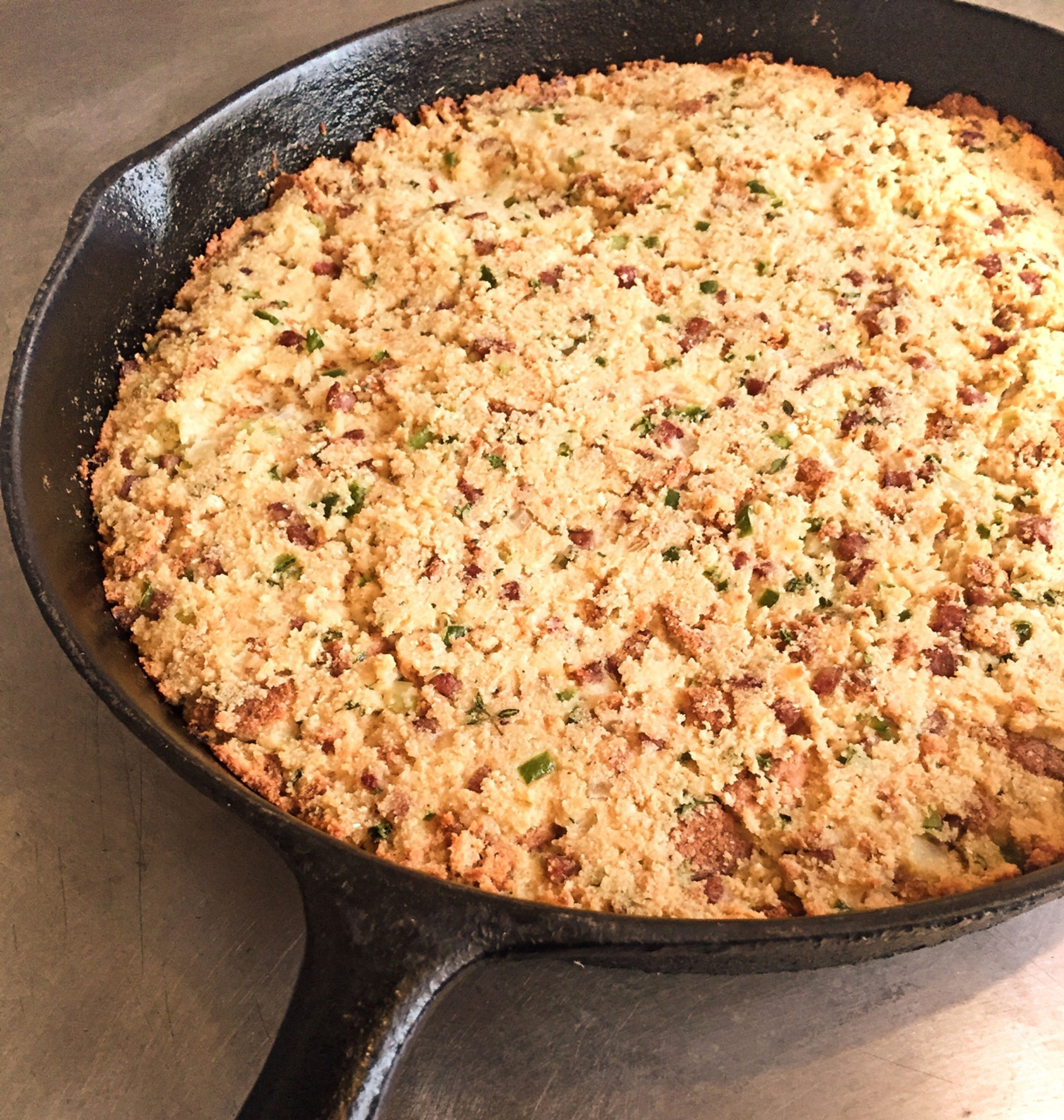 Chef Bootcamp alum Jennifer Hill Booker turns spoonbread into a celebratory side by incorporating a base layer of pimento cheese crafted with extra-sharp cheddar and a garnish of chopped green onions.