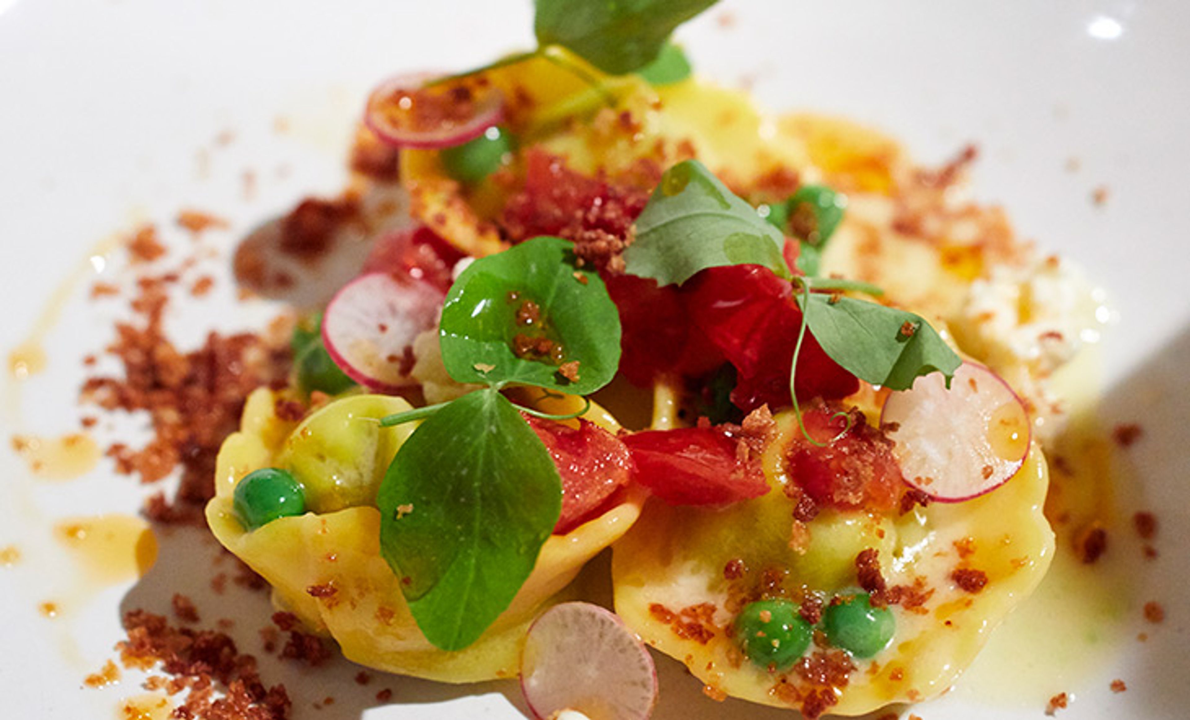 English Pea Cappellacci with Willow Creek Cheese, Sungold Tomatoes, Calabrian Chiles, and Bottarga Bread Crumbs (Photo: David Chow)