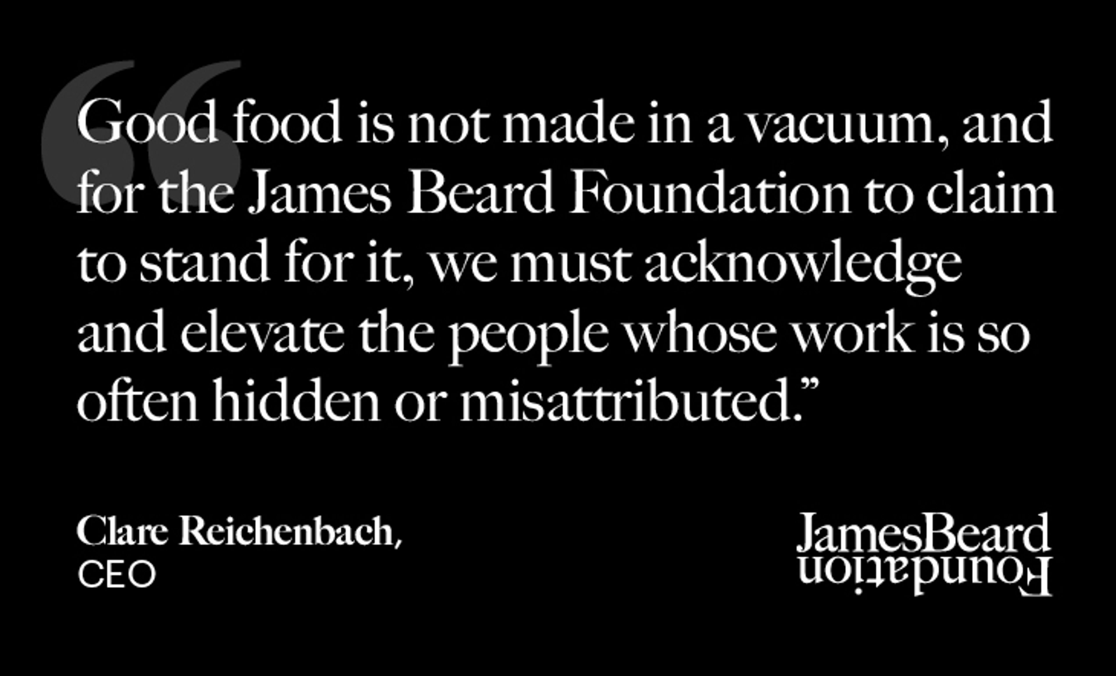 This is not a quick fix. We aren’t just going to try to make things look better. We’re going to do the work to make the industry better for the Black and Brown people who not only make up half of our industry, but who are fundamental to the history and expression of America’s food culture—past, present, and future. Good food is not made in a vacuum, and for the James Beard Foundation to claim to stand for it, we must acknowledge and elevate the people who create it, especially those whose work is so often hidden or misattributed.