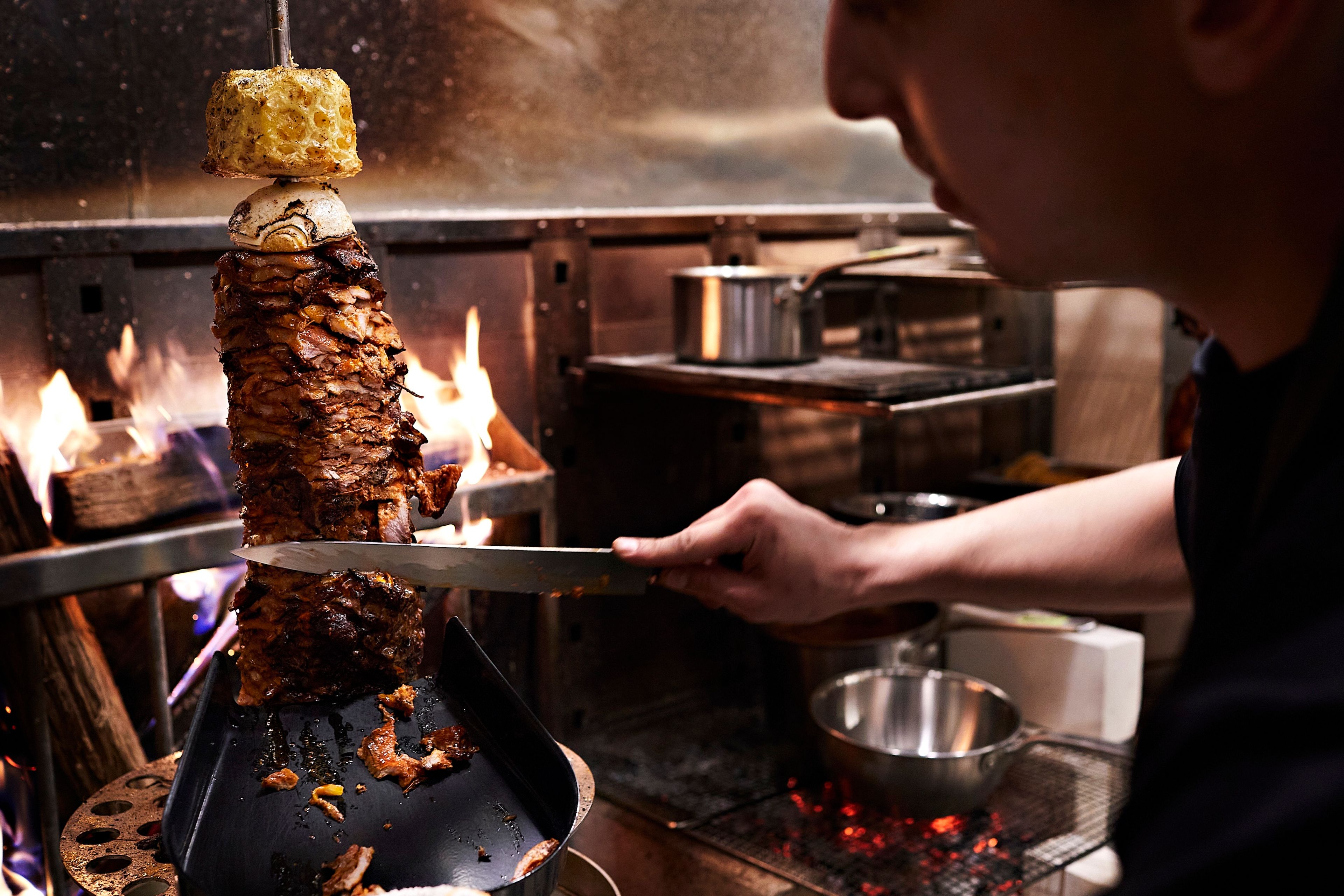 Wood-roasted pork al pastor is carved straight off the trompo into tacos at Pascual. (Photo: Deb Lindsey)