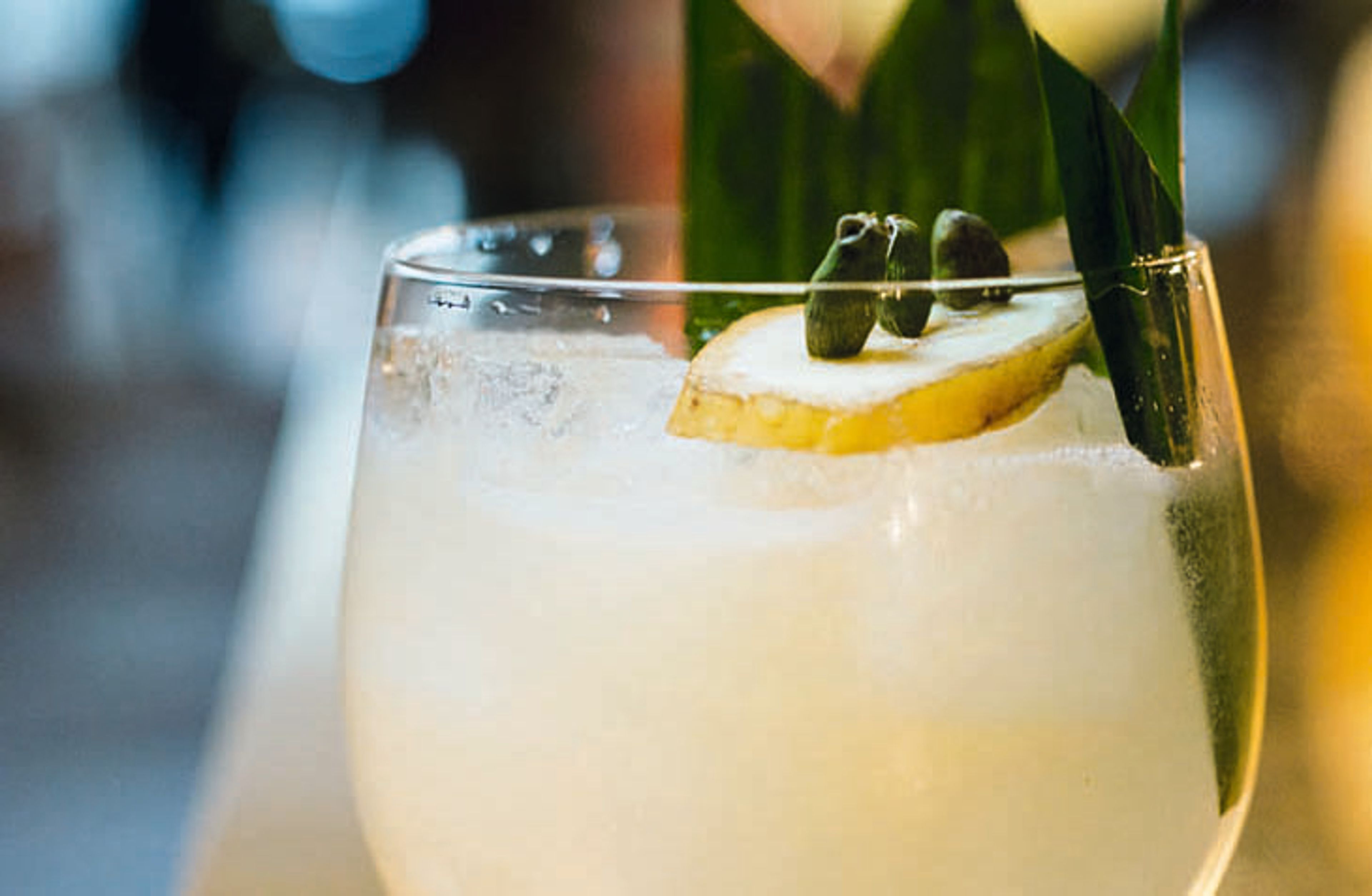To start, Rafacz muddles two banana slices and a small handful of cardamom pods in a shaker until the seeds break open and release their intoxicating aroma. Then, he adds white rum, lime and apple juice, unmistakably tropical Velvet Falernum liqueur, and a homemade cardamom honey. Finally, Rafacz drops in a bit of Bob’s Cardamom Bitters (a favorite of especially particular bartenders) before shaking the drink up and double-straining it over ice. Garnished with banana leaves and a few extra cardamom pods, it’s the perfect way to celebrate some crave-worthy Caribbean flavors. Get the recipe.