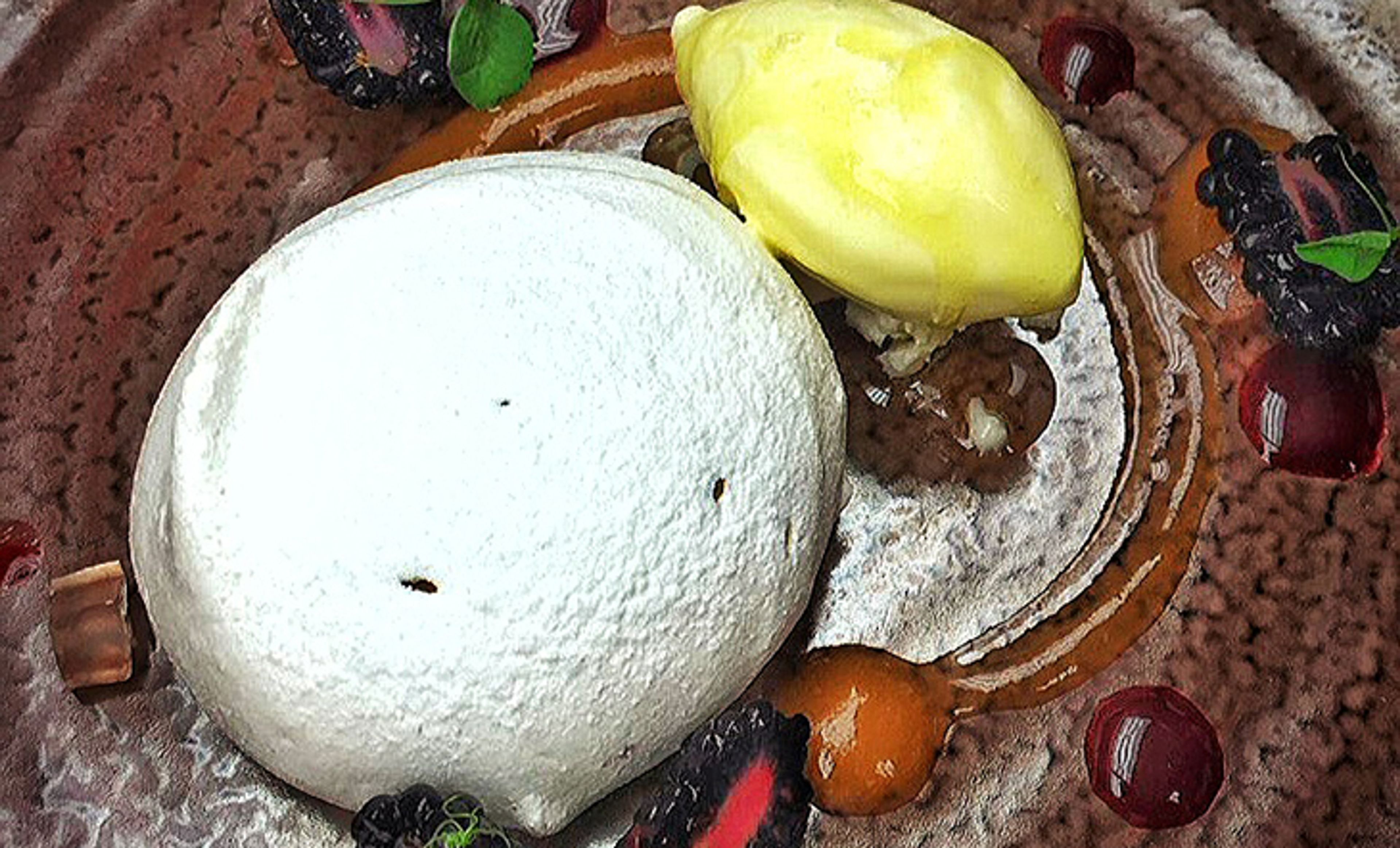 Peach Pavlova with Blackberries and Olive Oil Ice Cream