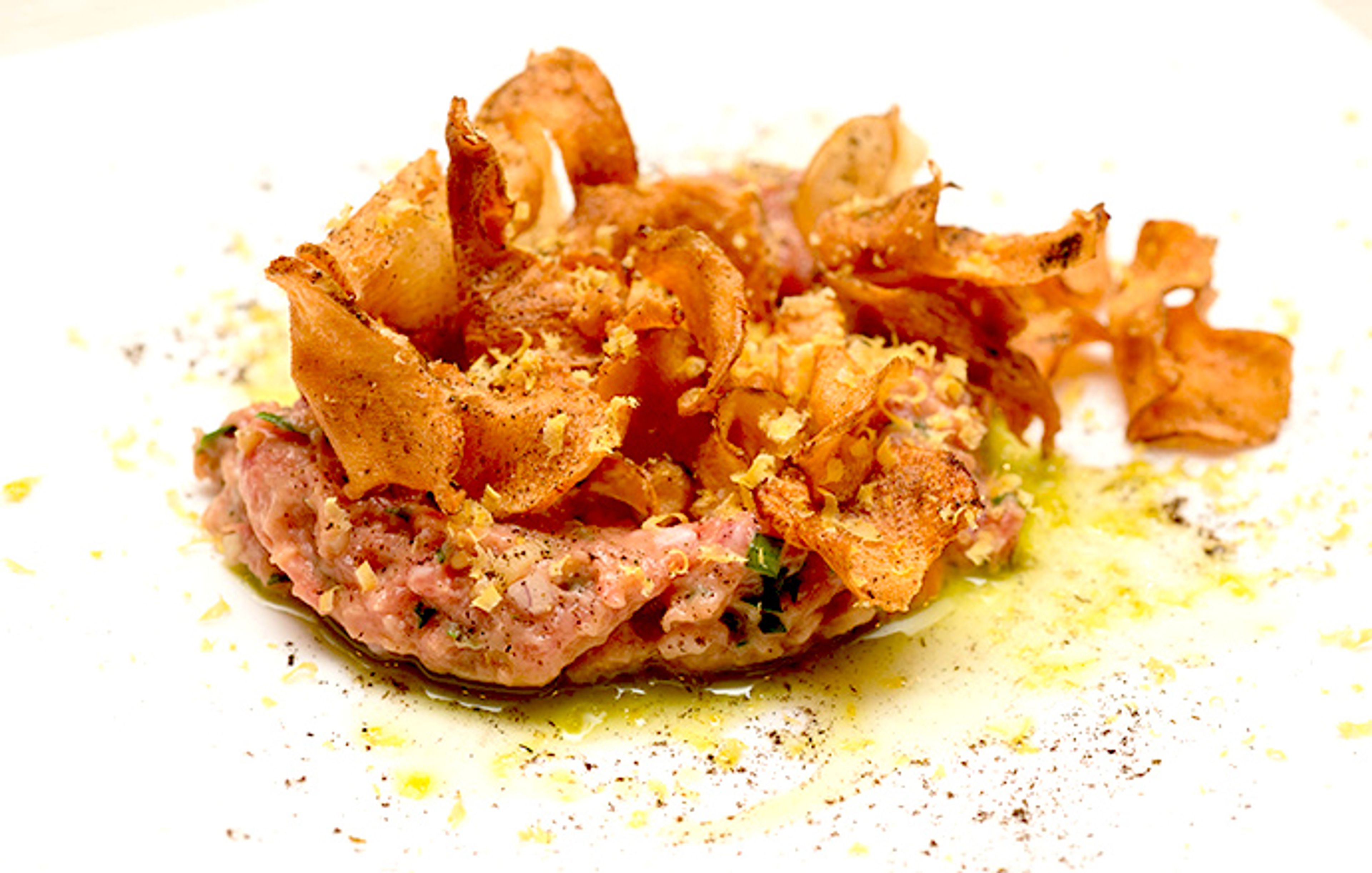 Cervelle meunière is actually fairly old-hat bistro fare (Americans are more familiar with sole meunière), but it’s reinvigorated in the hands of the Miami-based Pubbelly boys, who serve their pan-fried and expertly browned brains with an umami-fied brown butter, a tartar sauce enriched with Florida blue crab, and a one-two salt punch in the form of capers and crunchy sea beans. —AM